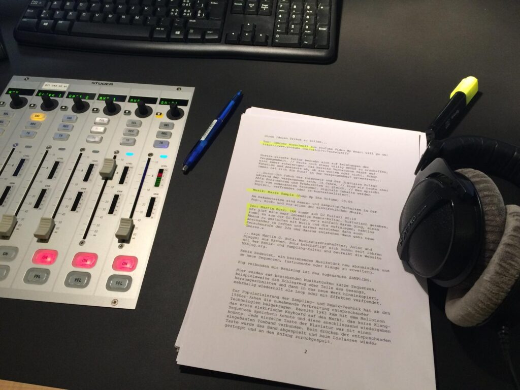 Philipp Bürkler hat Mikrofon- und Reportageerfahrung seit rund 25 Jahren: Auf Sendung im Studio des damaligen Radio aktuell in St.Gallen, ca 2003 (oben). Im SRF-Nachrichtenstudio Bern, 2012. Manuskript für eine grössere Reportage während der Produktion.